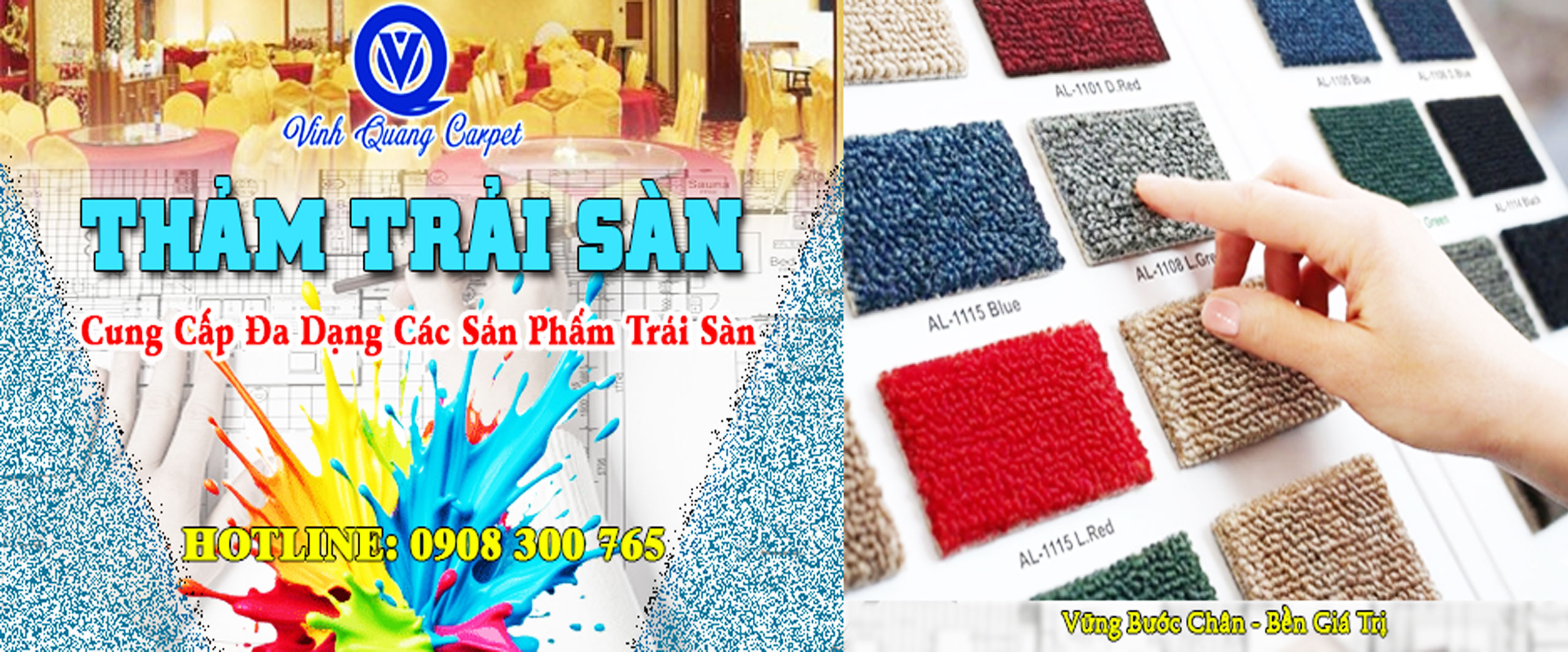 Thảm trải sàn Quang Vinh hỗ trợ thi công thảm trải sàn, thảm lót sàn cho khách sạn, quán cafe, shop thời trang, trung tâm thương mại, nhà xưởng, phòng tập gym, thẩm mỹ viện tại TP.HCM